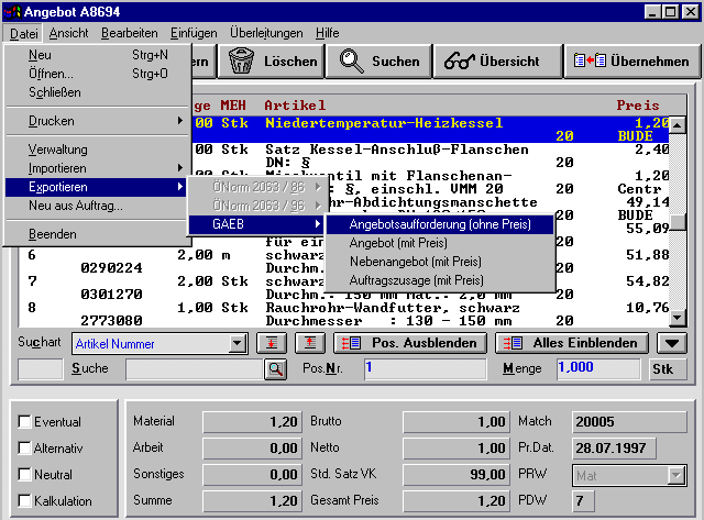 Angebote können auch als Leistungsverzeichnis auf Diskette ausgegeben und ausgedruckt werden.